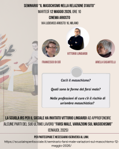 Martedì 12 maggio 2026, dalle ore 10:00 alle ore 13:00, si terrà il seminario “Il masochismo nella relazione d’aiuto”, un incontro in dialogo con Vittorio Lingiardi, con la partecipazione di Francesco Di Ciò e Ariela Casartelli.